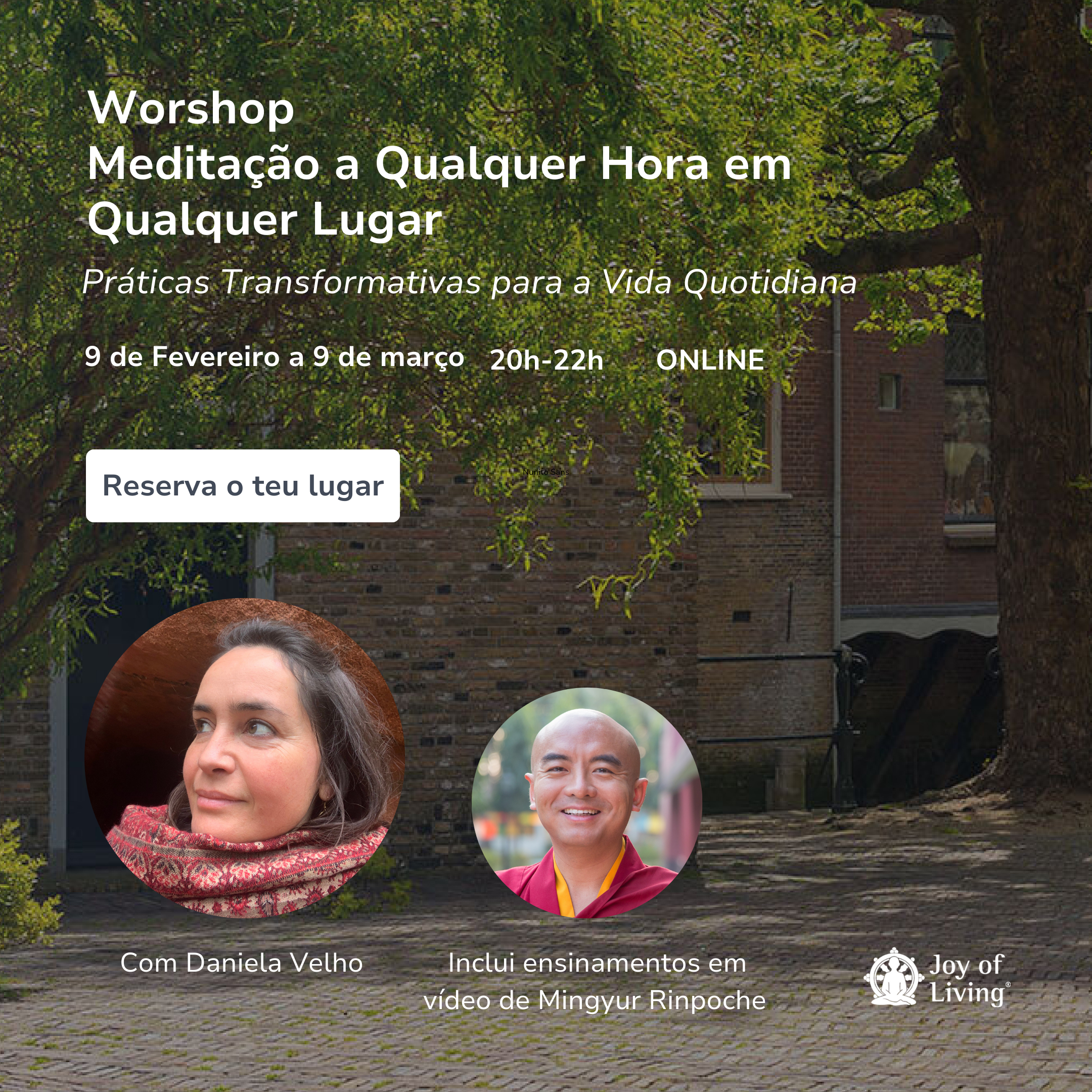 Qualquer pessoa pode juntar-se à “Meditação em Qualquer Momento, em Qualquer Lugar”, que será orientada pela Daniela Velho, (Professora de meditação certificada por Tergar – Tergar Certified Anytime Anywhere Meditation Teacher), independentemente da orientação religiosa ou cultural.